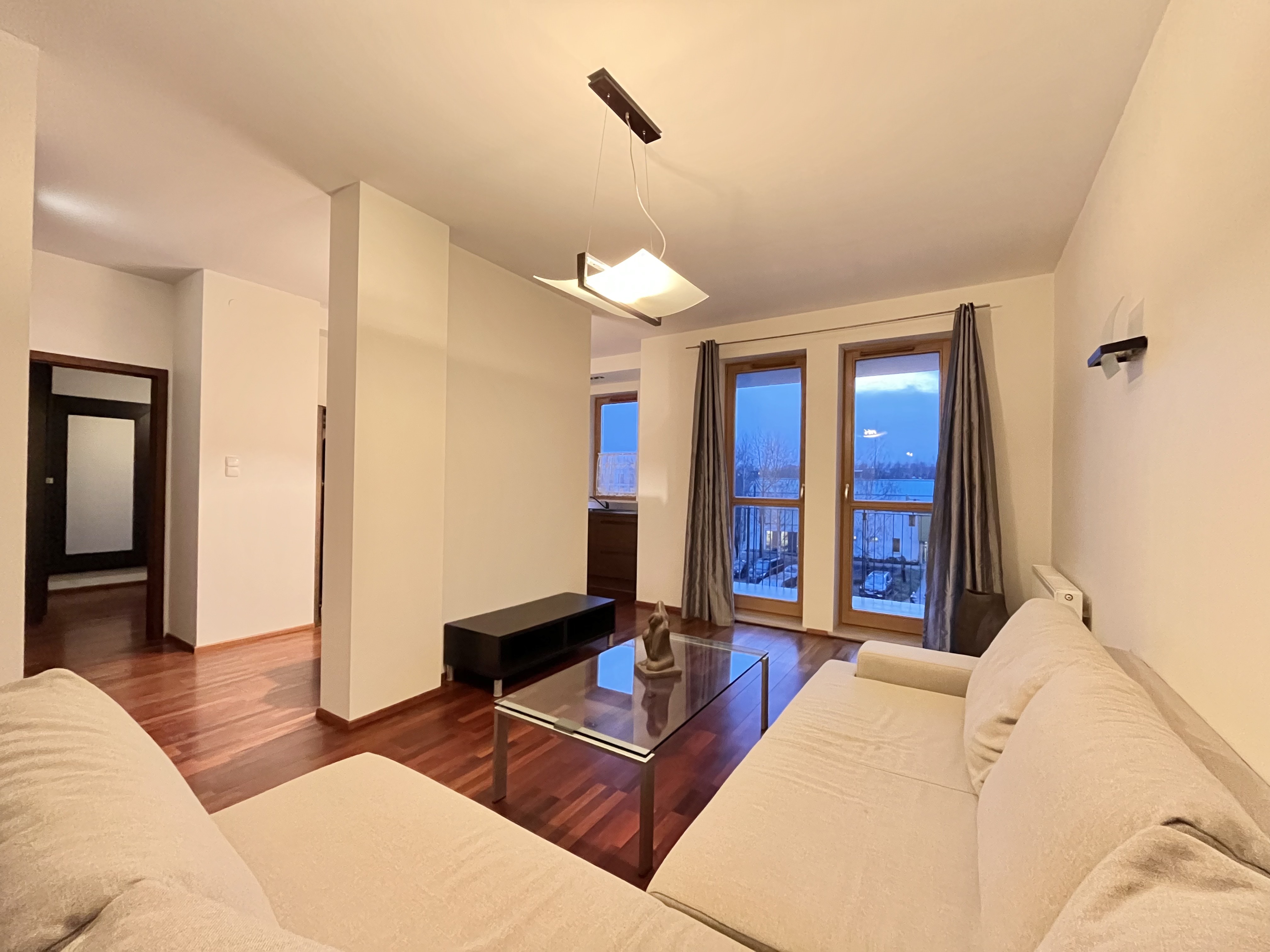 2-pokojowe mieszkanie o powierzchni 53,8 m², zlokalizowane na Błoniach w Wilanowie. Mieszkanie jest gotowe do wprowadzenia i dostępne od zaraz. Układ i wyposażenie : Salon: Przestronny, jasny, wyposażony w rozkładaną kanapę. Kuchnia: Wydzielona, w pełni wyposażona (w tym zmywarka, piekarnik) z wygodnym stołem obiadowym. Sypialnia: Przytulna, z dużym łóżkiem dwuosobowym i pojemną szafą. Łazienka: Komfortowa, z przestronnym prysznicem, pralką i WC. Mieszkanie znajduje się w 4-piętrowym bloku z windą, na osiedlu strzeżonym i monitorowanym, które posiada zamknięte, wewnętrzne patio. Lokalizacja : Osiedle znajduje się w wyjątkowym punkcie Wilanowa, gdzie cała niezbędna infrastruktura – handlowa, usługowa, oświatowa i rozrywkowa – jest w zasięgu spaceru. Lokalizacja oferuje liczne restauracje, kawiarnie, sklepy, punkty usługowe, a także tereny zielone idealne do relaksu na świeżym powietrzu.Dla dbających o czystość, niepalących i bez zwierząt. Kaucja 4.300 PLN. Cena zawiera opłaty administracyjne wraz z zaliczkami na wodę i c.o. Dodatkowo płatna energia wg zużycia. Obowiązkowe OC najemcy na okres najmu (małe koszty). Dostępne od zaraz.